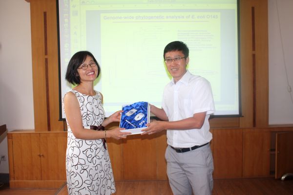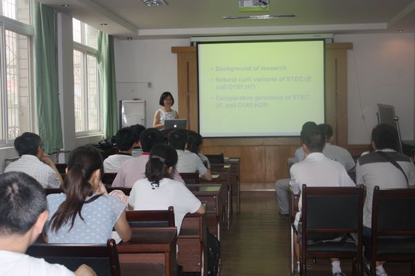 Michelle Qiu Carter博士为我院师生作了题为“Biology and Genomics of Shiga-toxin Producing Escherichia coli”的学术报告。刘学波教授主持报告会,丁武、王新、杨保伟、刘变芳等教师和30余名研究生参加报告会,并与外宾就学术报告中的共性问题进行了深入研讨。双方互相介绍了各自学术领域、在研的学术课题等,并就今后加强科研合作交换了意见。